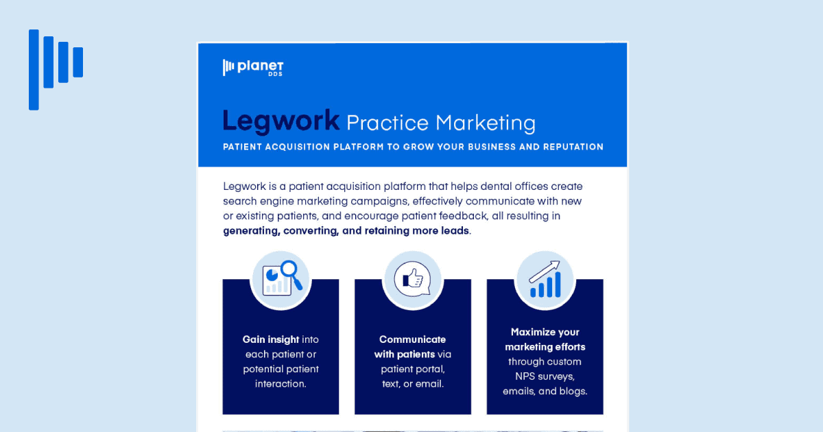 Legwork is a patient acquisition platform that helps dental offices create search engine marketing campaigns, effectively communicate with new or existing patients, and encourage patient feedback, all resulting in generating, converting, and retaining more leads.