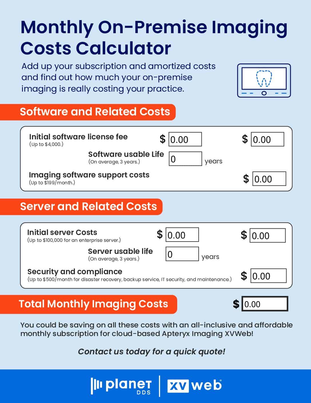 Add up your subscription and amortized costs and find out how much your on-premise imaging is really costing your practice. Imaging Interactive Calculator